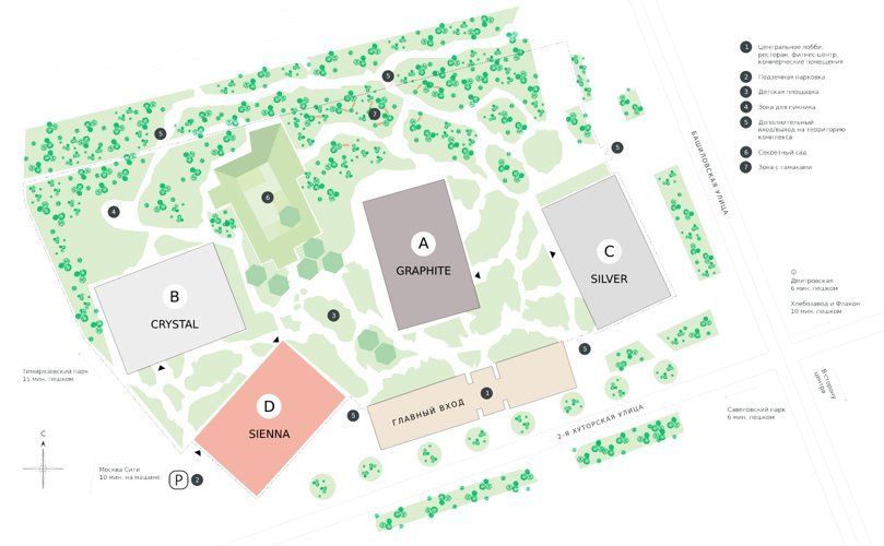 Жилой комплекс состоит из 4 жилых небоскребов разной высотности и находится в районе «Савеловский». В 10 минутах пешком расположены модные пространства «Хлебозавод № 2» и дизайн-завод «Флакон», где проводятся выставки, лекции известных спикеров, фестивали и перформансы. В 15 минутах пешком — Тимирязевский парк 232 га и парк «Дубки».