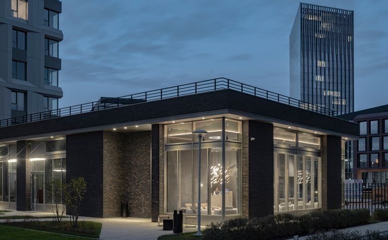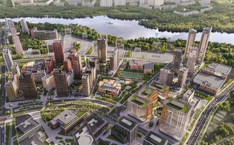 Вход осуществляется по специальным картам. Проект ландшафтного дизайна разработан в компании Gillespies. В микрорайоне высадят центральный парк и благоустроят набережную Москвы-реки.