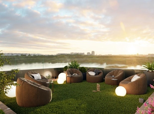В урбан-блоке Park 2 на крыше секционного дома резидентов расположены две террасы, на которых можно загорать, общаться с друзьями или заниматься йогой. А ещё отсюда можно любоваться видами на воду, парки и город.