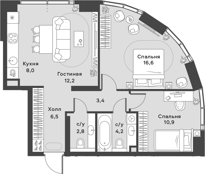 Площадь от 34.8 м2