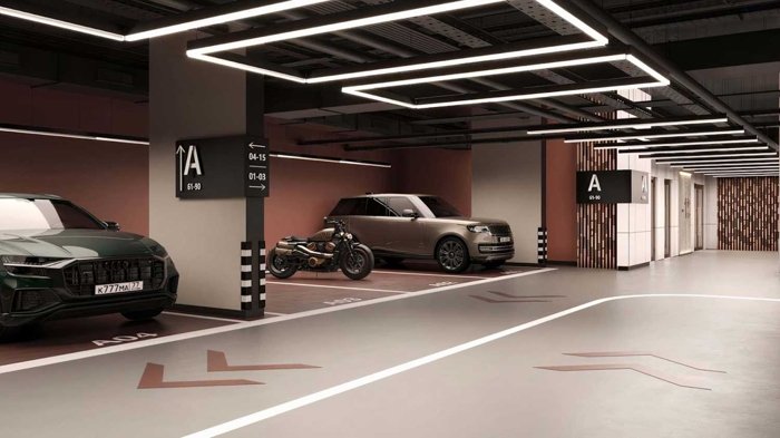 Двухэтажный паркинг по индивидуальному дизайну бюро ABOVE предусматривает: